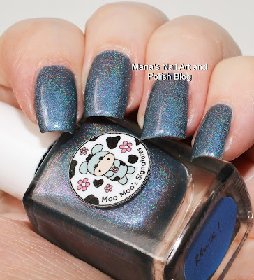 Moo Moo Signatures RAWR! is an elegant grey-blue holo with purple-blue-red-orange color shifting flakies. It’s shown in two coats with a coat of Seche Vite.