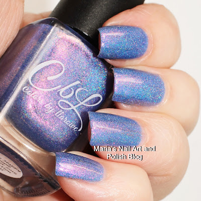 Colors by Llarowe Shiny Happy People is described like this: “A periwinkle blue with purple sheen scattered holo with intense shimmer that shifts pink to copper to green. This polish glows and is a true chameleon!” – and I agree, it’s just like that! In the sun the holo and the shimmer flares gorgeously and in indoor light settings the pink shimmer takes the lead. You see it in two coats with a coat of Seche Vite.