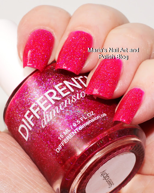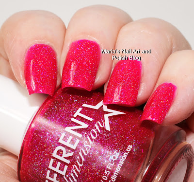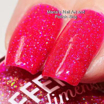 It is a gorgeous and vibrant magenta leaning hot pink scattered holo with holo shards and violet blue shimmer. Because of the shards the it dries textured, so I recommend a top coat. You see it in two with a coat of Seche Vite.