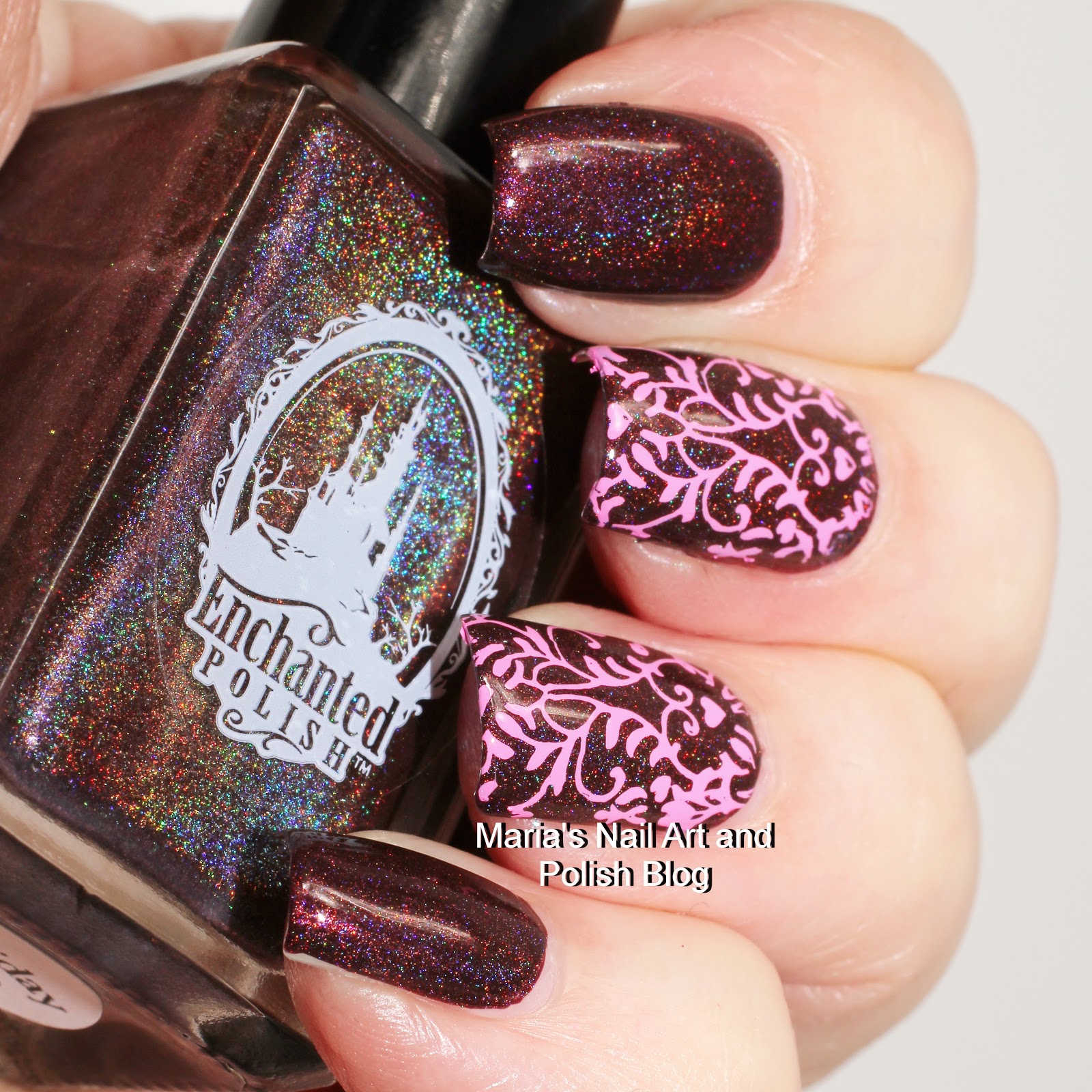 Take 59: Base Enchanted Polish Holiday 2013 stamped with Dance Legend Pink 11 (stamping polish), plate Cici & Sisi Wedding Season 01 (acrylic plate), stamper Daschica Jumbo Clear Jelly.