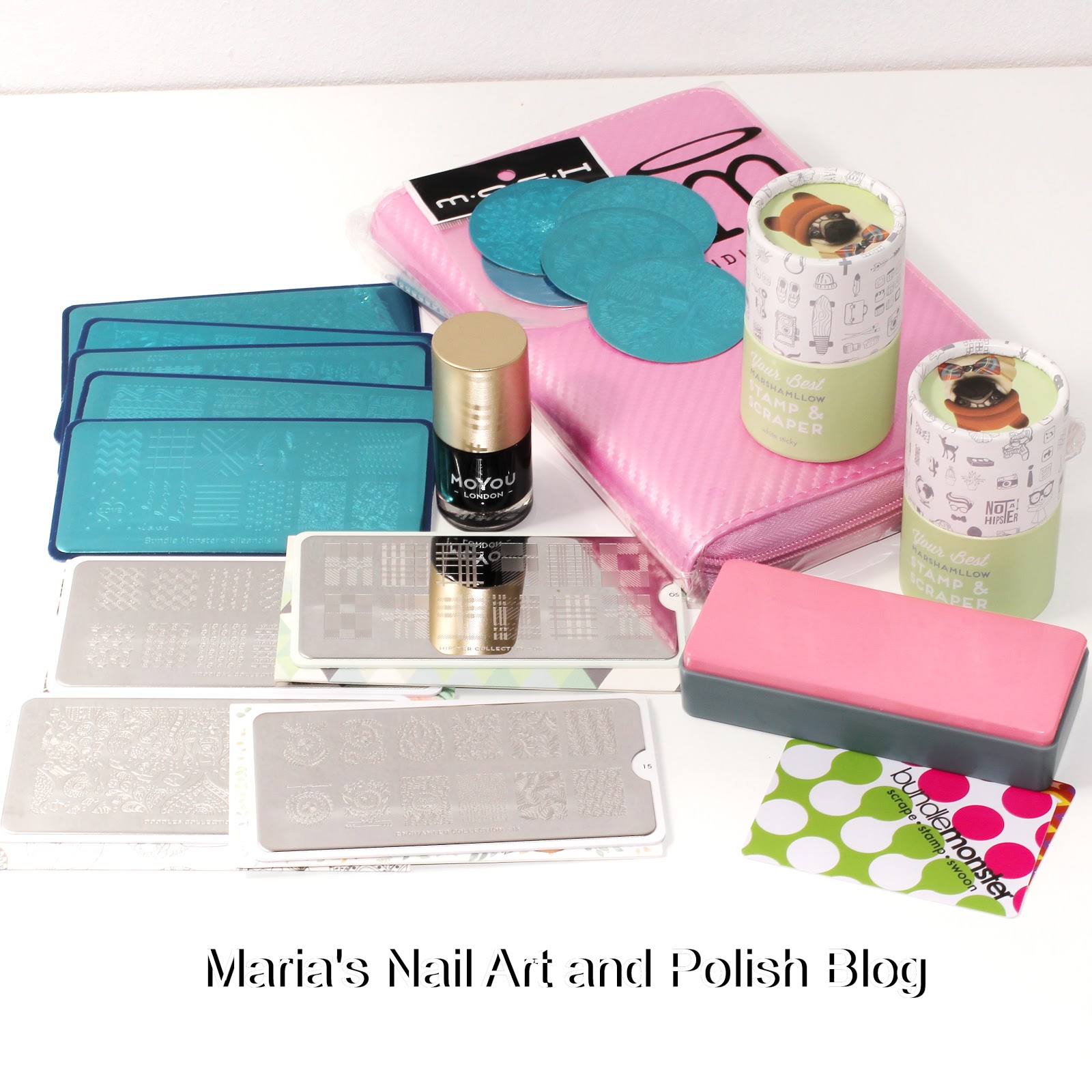 Wonderful stamping nail mail from Pretty Polish - more Bundle Monster plates, the new Mochi stamper and an extra plate holder for small plates. I also got new MoYou plates, an extra Marshmallow sticky stamper + the non-sticky Marshmallow and the Black Knight stamping polish!