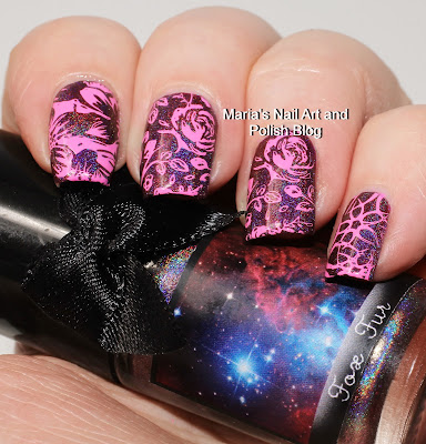 Take 98: The base is Esmaltes da Kelly Fox Fur stamped with Dance Legend 11 Pink stamping polish, plate Pueen Nature Lover 01, stamper UberChic XL clear stamper.