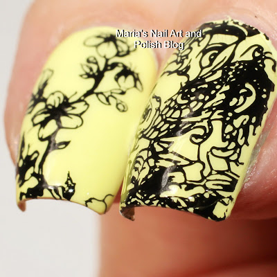 Take 99: The base is Fancy Gloss Lemon Pie stamped with Jolifin Night Black stamping Polish, plate UberChic The Far East 01, stamper UberChic XL clear stamper.