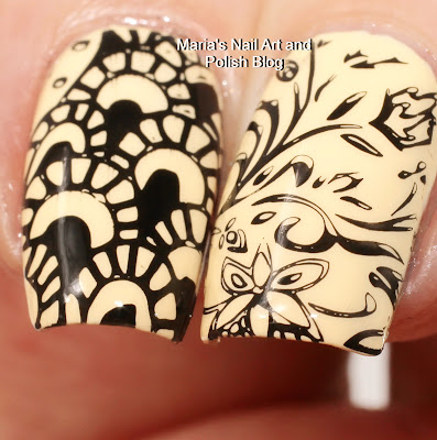 Take 159: The base is Mary Kay Lemon Parfait stamped with Jolifin Night Black, plate Curali 001, stamper Fab Ur Nails Jumbo Stamper.