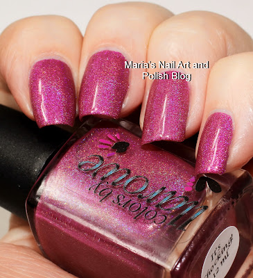 Colors by Llarowe It’s Shocking is a beautiful pink magenta holo with a medium strong effect in the sun, but I also see weak signs of it in indoor light settings.