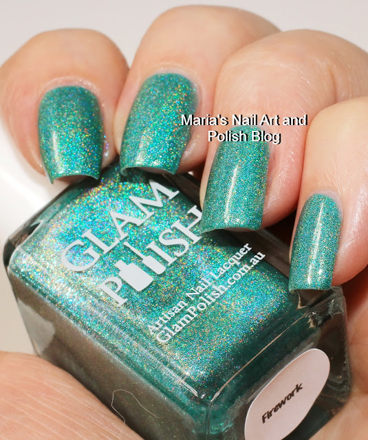 Glam Polish Firework is from the Gleek collection, I have previously shown you 4 others. It’s described as a jade green holo with aqua and blue glass flecks – and I think that’s a good description for this green beauty. You see it in two easy coats with a coat of Seche Vite.
